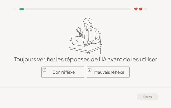 Vos collaborateurs progressent à leur rythme à travers 20 leçons de 3 minutes réparties en 5 chapitres : comprendre l'IA, l'utiliser efficacement, identifier les risques, adopter une approche responsable et respecter la conformité. Chaque leçon complétée rapporte des points et des tickets pour débloquer le AI Quiz.
